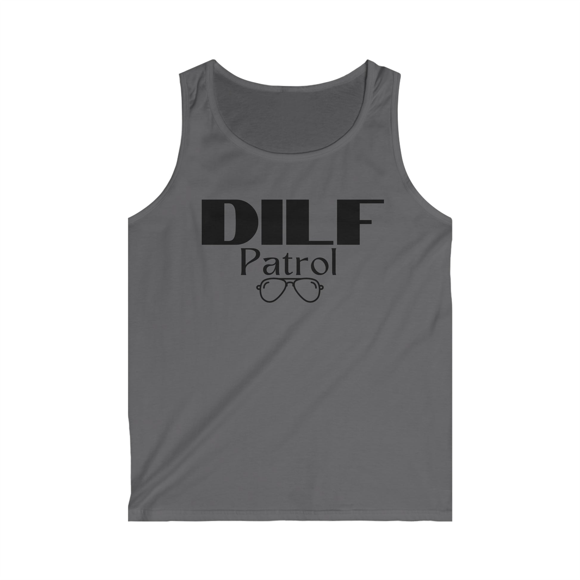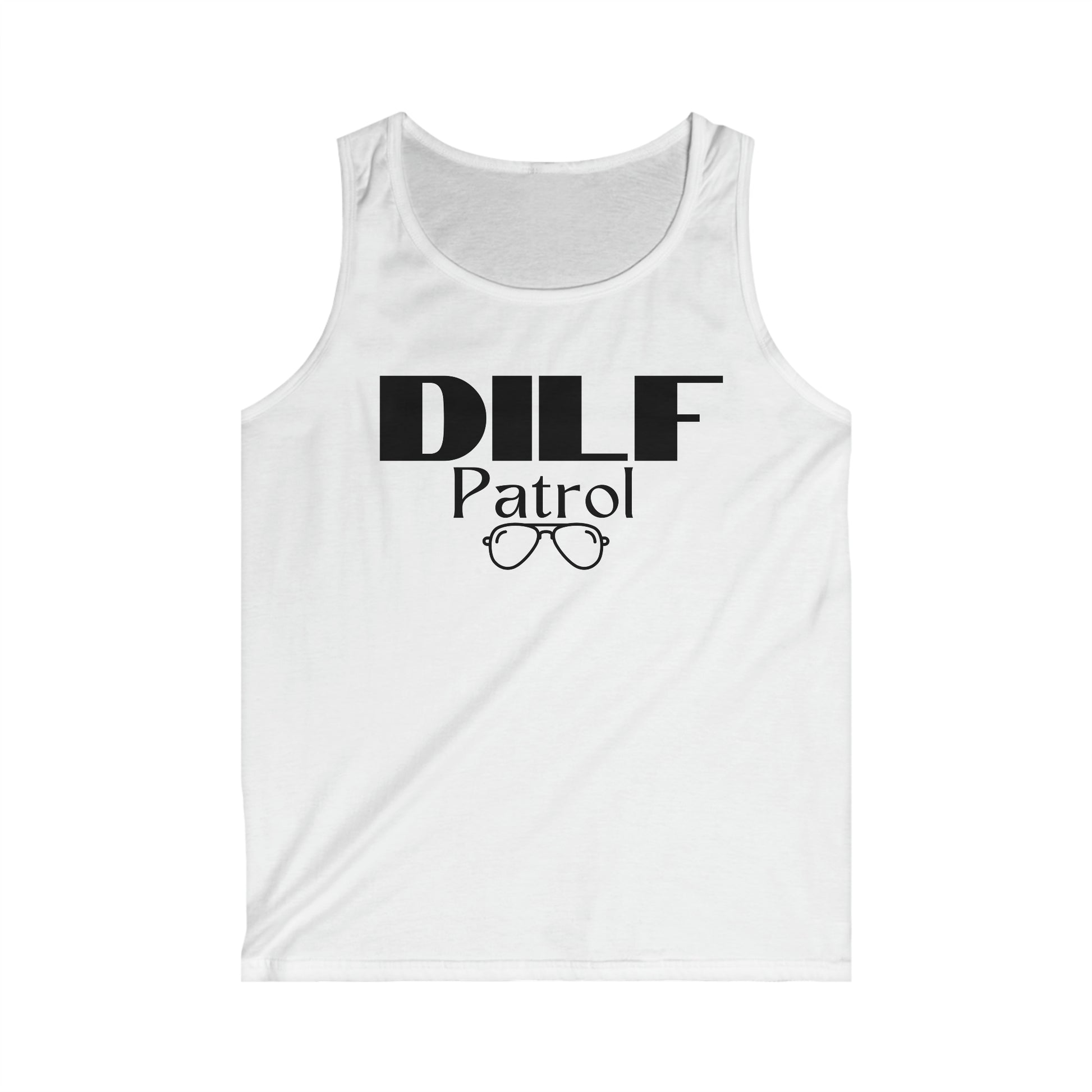 DILF Patrol men's soft-style tank top has a slight taper under the arms to avoid any pinching. The garment is made from cotton with polyester in the heather colors. There are no side seams increasing comfortability. All bindings are the same fabric as the main body.