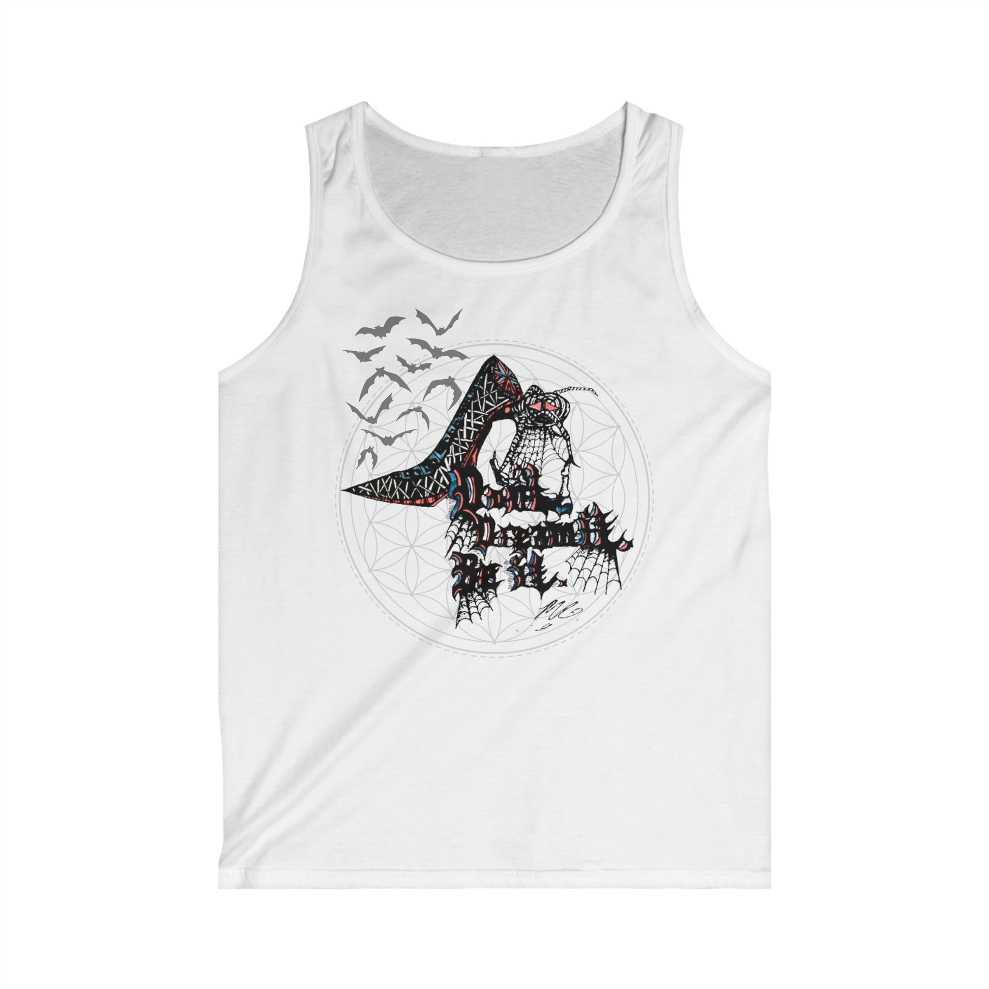 Our Don't Dream It, Be It is a custom design signed by our artist. Calling back to a more gothic styling, this piece was inspired by Rocky Horror Picture Show’s Dr. Frank-N-Furter. A true depiction of androgyny and freedom, as he coos “don’t dream it, be it"; Completed with a stiletto for a touch of drag, a black widow spider as the heel, spinning her web. The men's soft-style tank top has a slight taper under the arms. To avoid any pinching, this area has extra space built in. The garment is made from cotton - with polyester in the brighter colors. There are no side seams further increasing the fitting comfort.