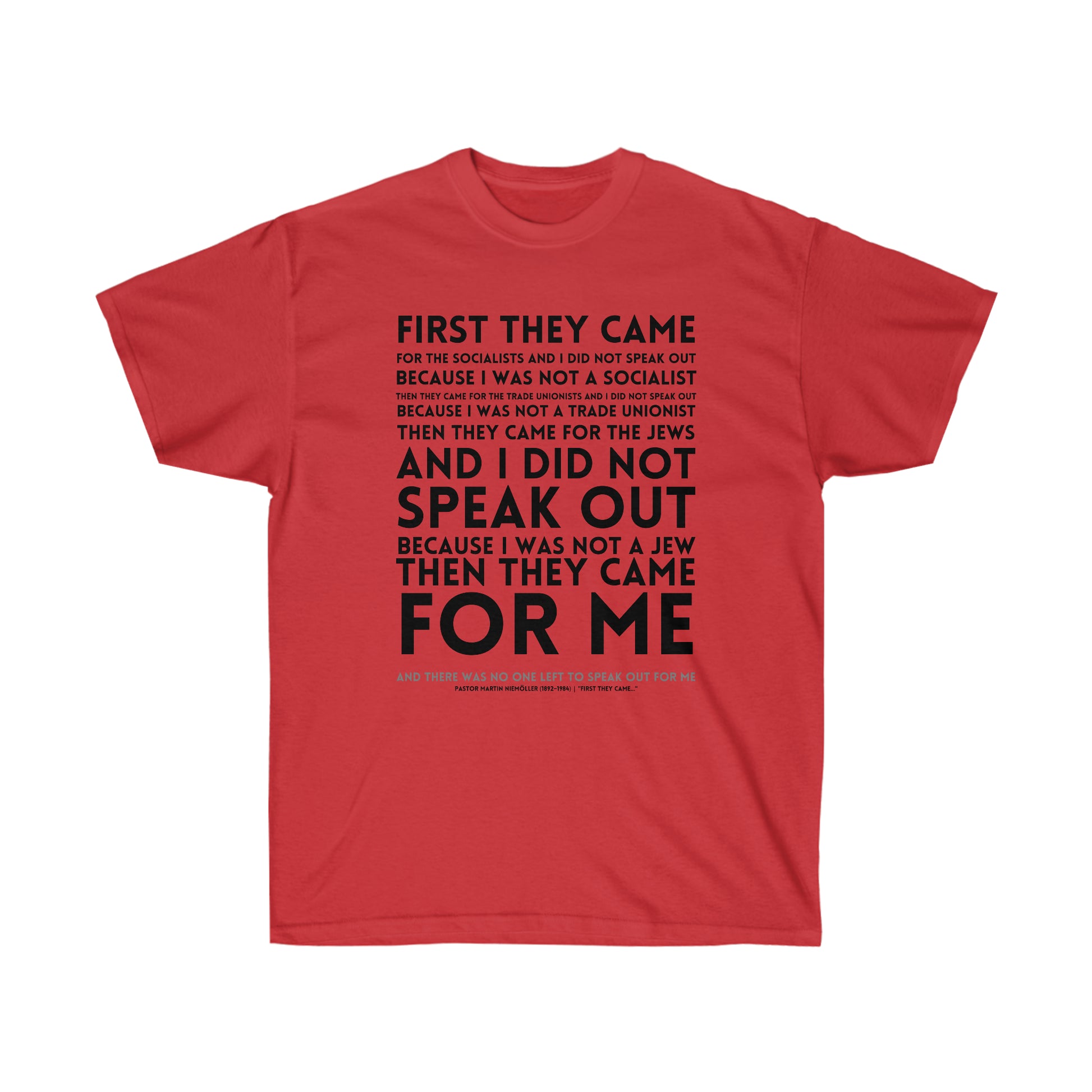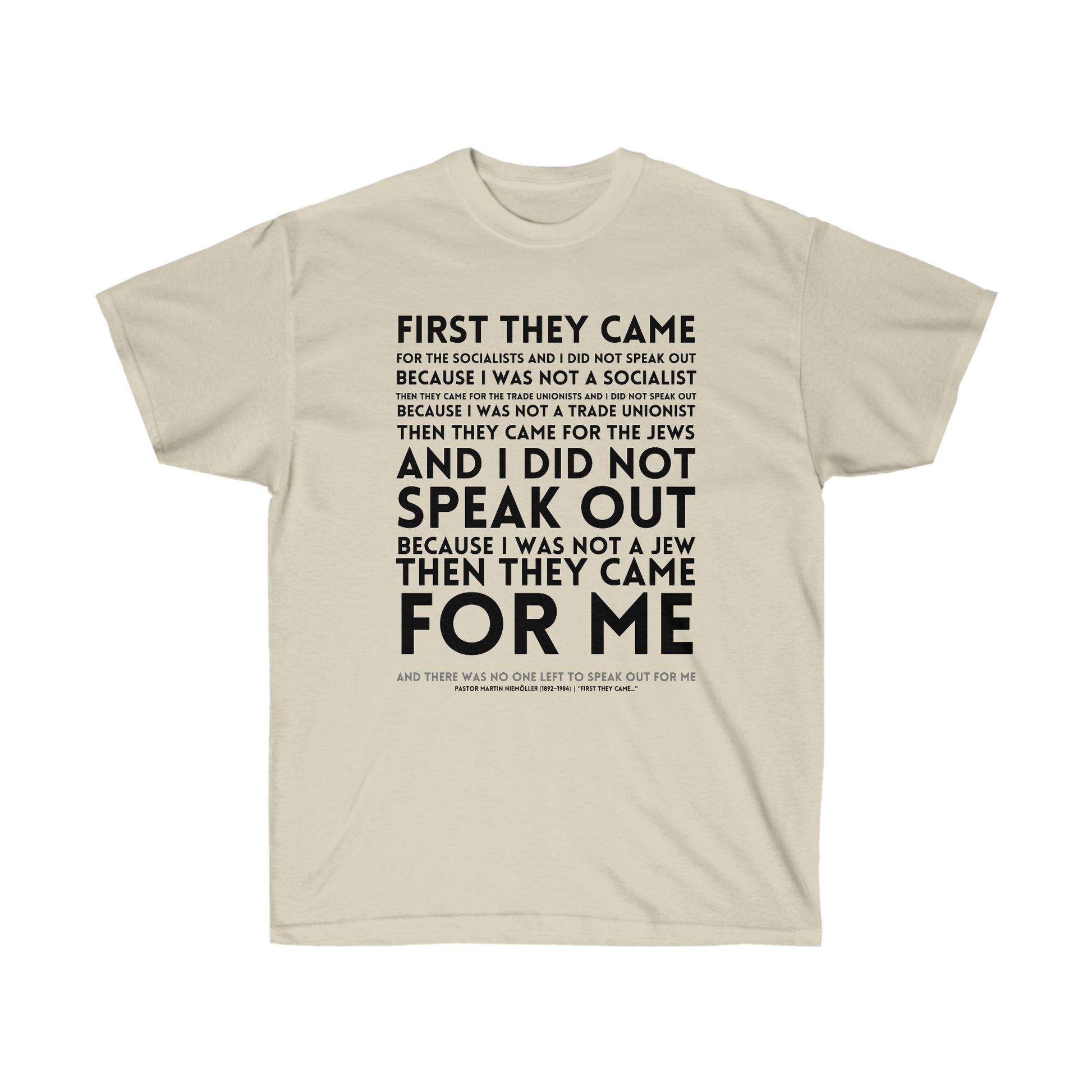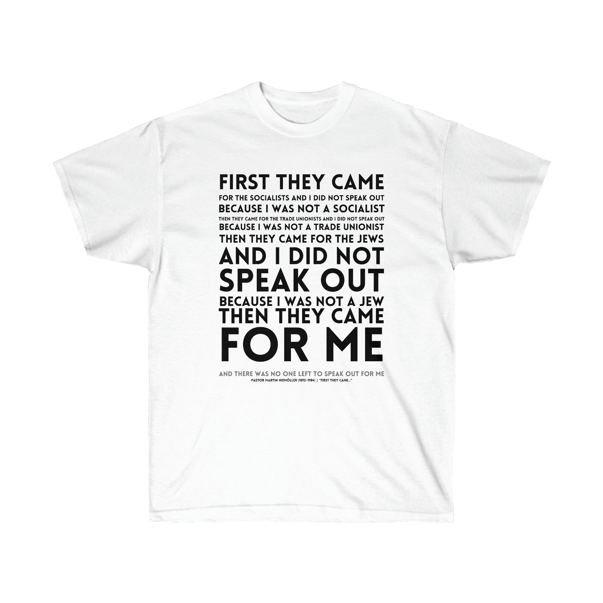Our First They Came unisex ultra cotton tee is a classic with a simple message. Quality cotton construction means that designs are sure to wear comfortably with easy care. The shoulders are tapped for a good upper-body fit. There are no side seams, ensuring a clean, unbroken flow. The collar has ribbed knitting for improved elasticity. The materials that went into this product are sustainably sourced and economically friendly.