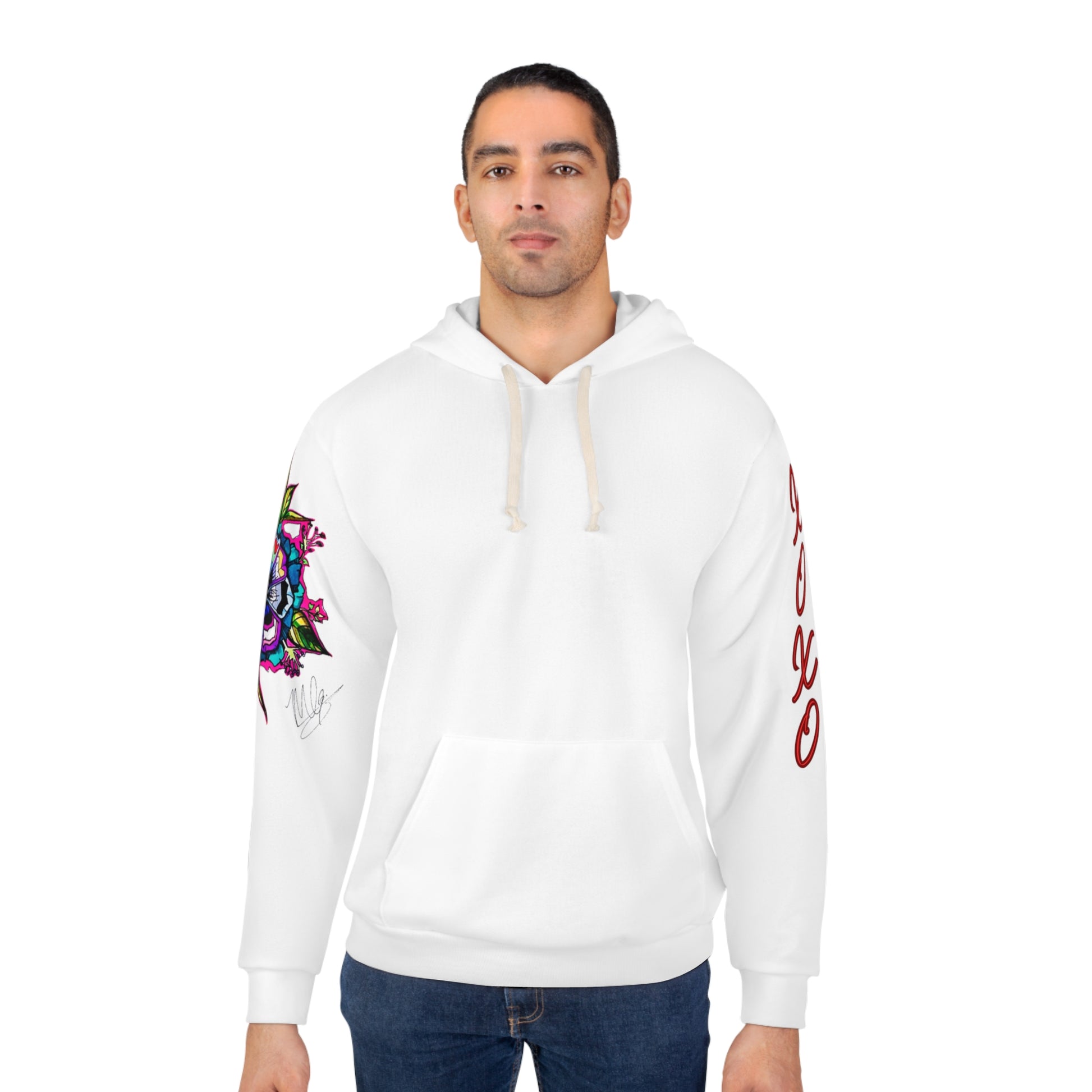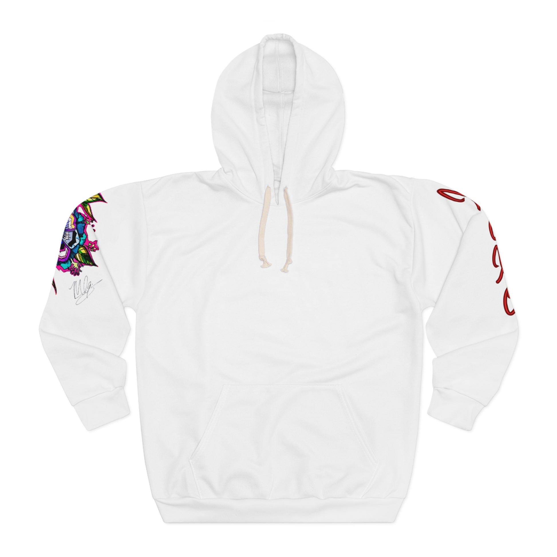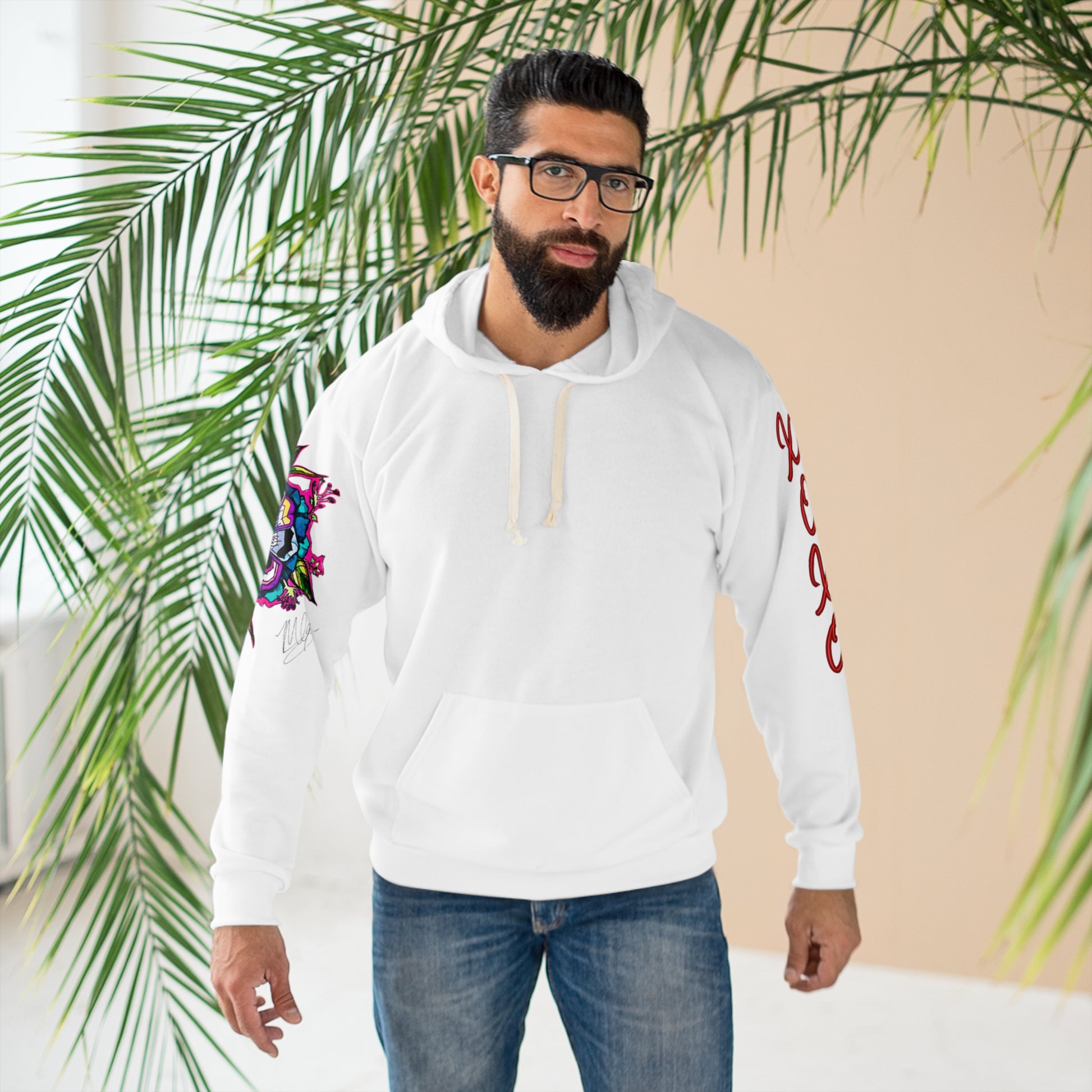 Our fabulous LGBT PRIDE drag queen steals the show with this trio print. This pullover hoodie is made for warmth and comfort. Made to be easily customizable without white lines at the seams, this all-over print pullover hoodie is waiting for you to add a great design and it instantly becomes fashionable. It features a large front pocket, hood with drawstring, and is custom cut and sewn.
