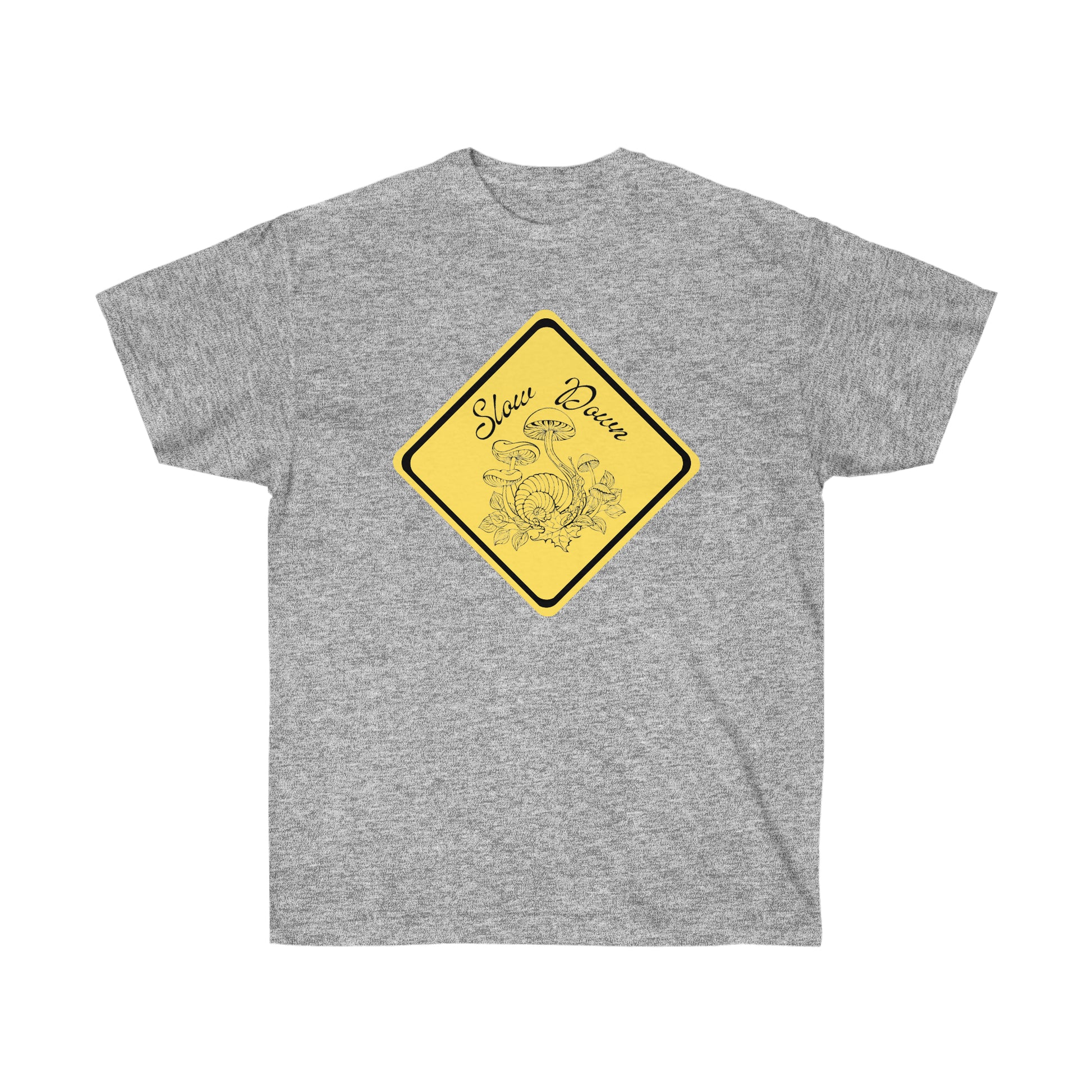 Our Slow Down Snail Mushroom Yield Sign unisex ultra cotton tee is a classic. Quality cotton construction means that designs are sure to wear comfortably with easy care. The shoulders are tapped for a good upper-body fit. There are no side seams, ensuring a clean, unbroken flow. The collar has ribbed knitting for improved elasticity. The materials that went into this product are sustainably sourced and economically friendly.