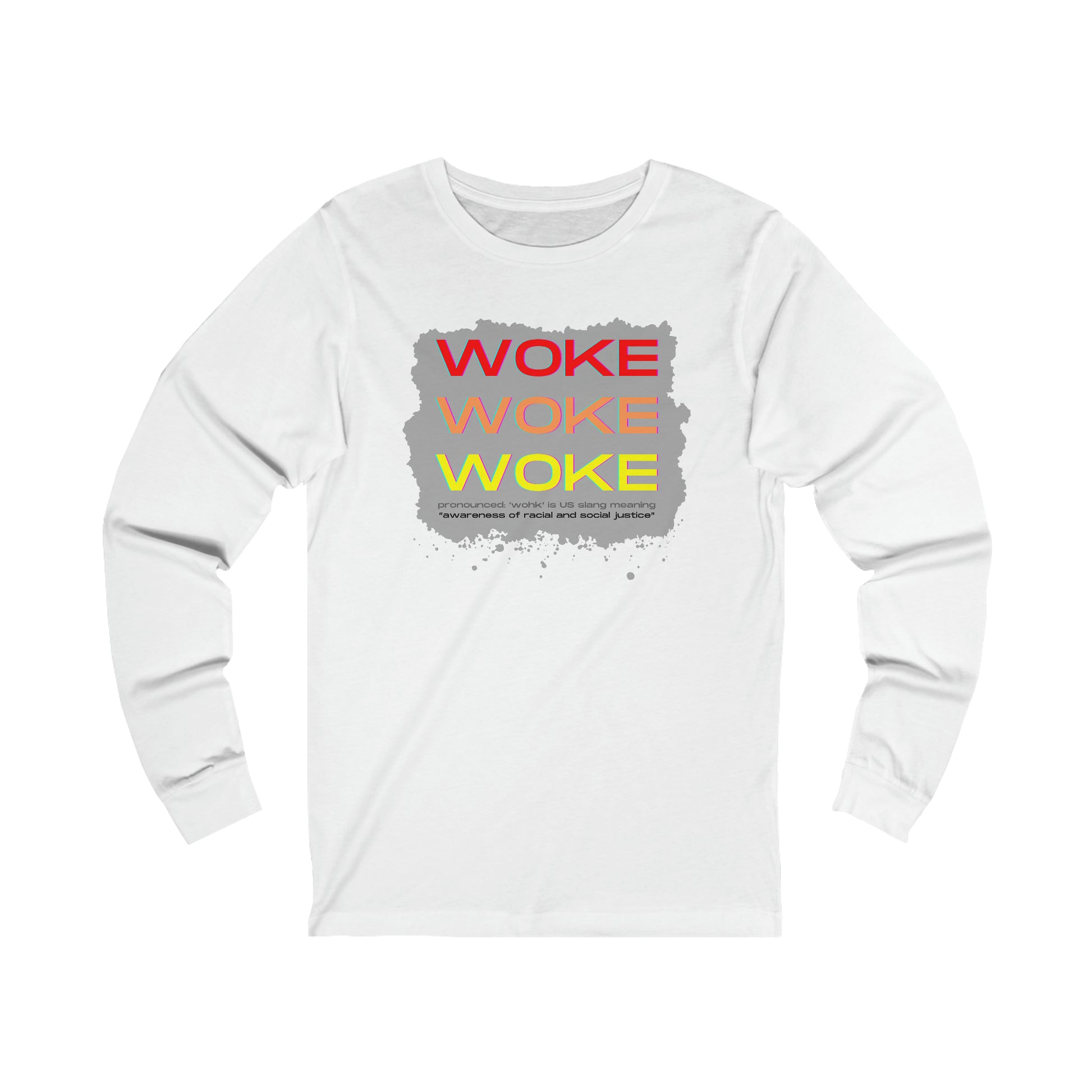 Our Woke Woke Woke design clarifies the meaning of what some take out of context. We believe it promotes a message for DEI or Diversity, Equity and Inclusion. This classic unisex long sleeve tee fits comfortably with easy care. Casually elegant with an excellent quality print.